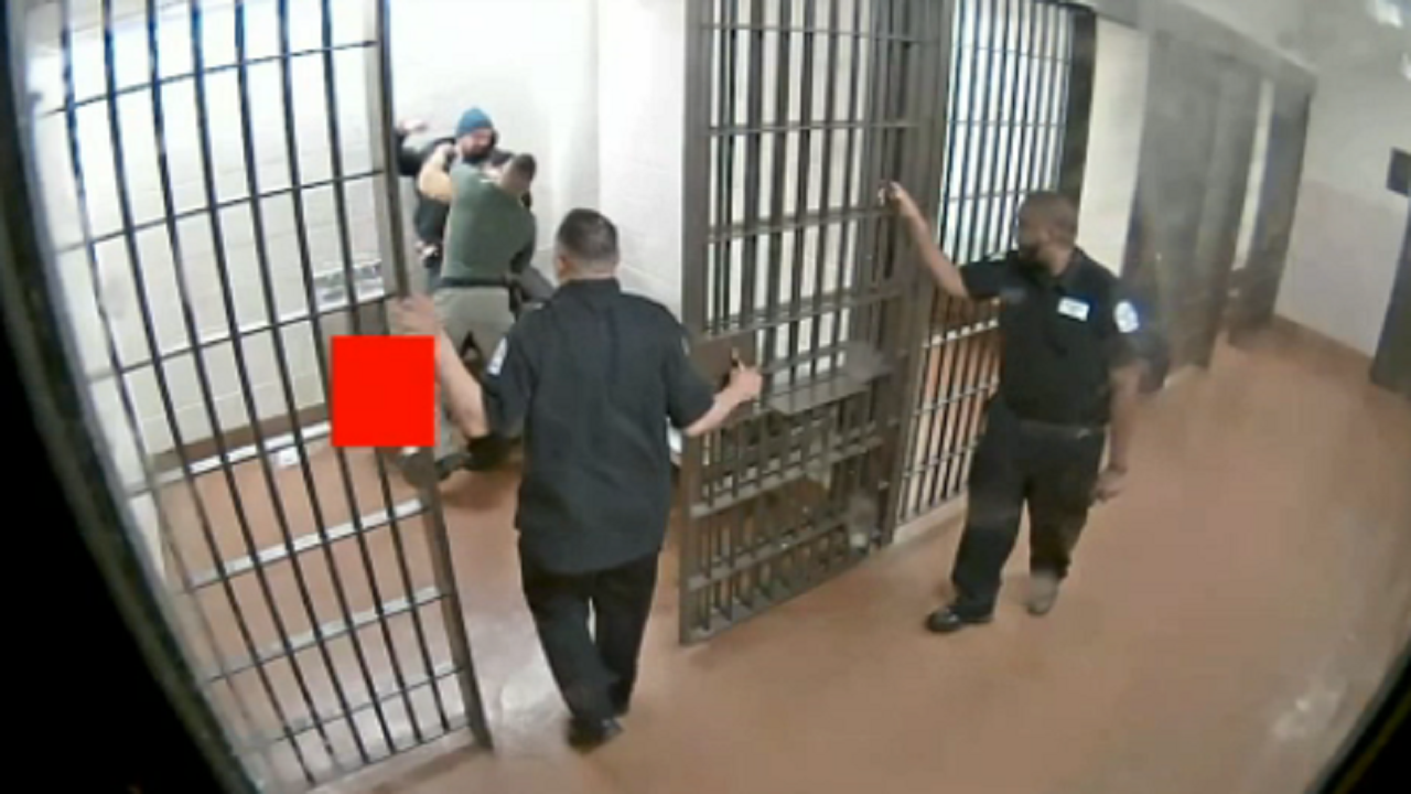The officer is seen punching Damien Stewart, who confronted him after his head was rubbed during a pat down inside a Chicago holding cell in 2019. (Courtesy of William Calloway)